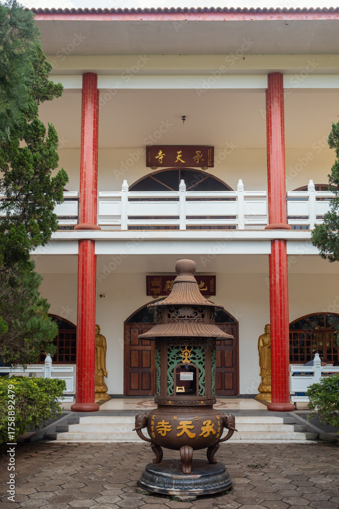 The main entrance of the Templo Budista Chen Tien, featuring striking red columns, white balustrades, and a traditional bronze incense urn in the foreground. Foz do Iguacu, Brazil.