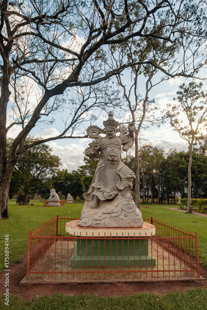 Stone statue of Virupaksa, the Heavenly King and protector of the West, holding his legendary serpent dragon at the Chen Tien Buddhist Temple in Foz do Iguacu, Brazil.