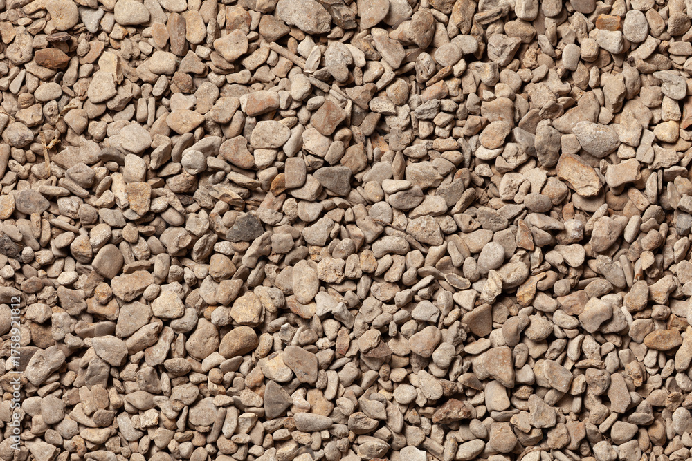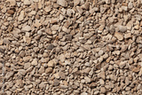 A dense, top-down view of gravel. The stones are small, irregularly shaped, and tightly packed, creating a uniform, earth-toned texture. They exhibit a natural mix of tan, gray, and beige colors