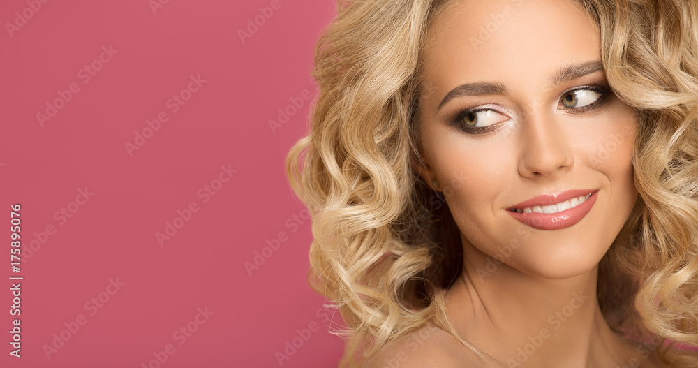 Blonde woman with curly beautiful hair smiling on pink background.