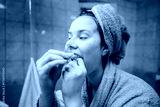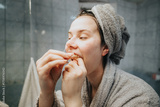 A woman in a grey robe and towel flosses her teeth in a tiled bathroom.