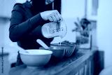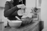 Close-up of a person pouring liquid into bowls on a counter top, preparing food