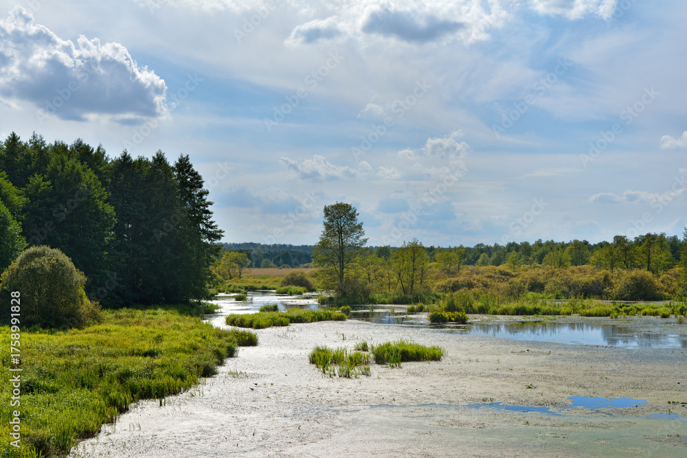 Wild marsh landscape with a quiet swamp and overgrown banks