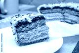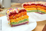 Slice of colorful rainbow cake with white frosting and sprinkles
