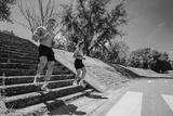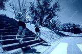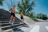 A young man and woman actively jogging down outdoor stairs in a sunny park environment, emphasizing energy, fitness, and outdoor activity.
