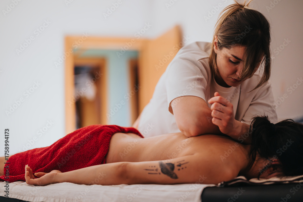 A massage therapist applies deep pressure on the back of a client for relaxation and muscle therapy. The scene captures a peaceful environment promoting stress relief and wellness through care.