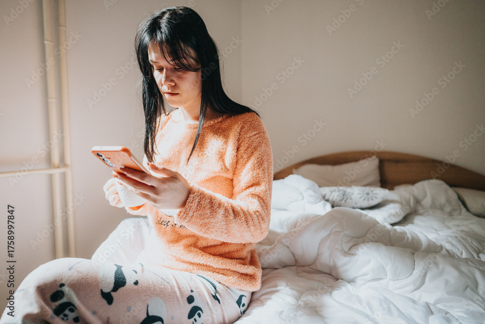 Woman sitting on bed wearing pajamas, holding a phone in a relaxed setting