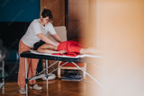A female therapist provides a soothing massage session to a client lying on a bed.