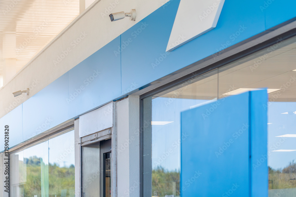 Main marquee facade or canopy, where the logo goes, above the entrance to a service gas station and store, perfect for graphic design mockups