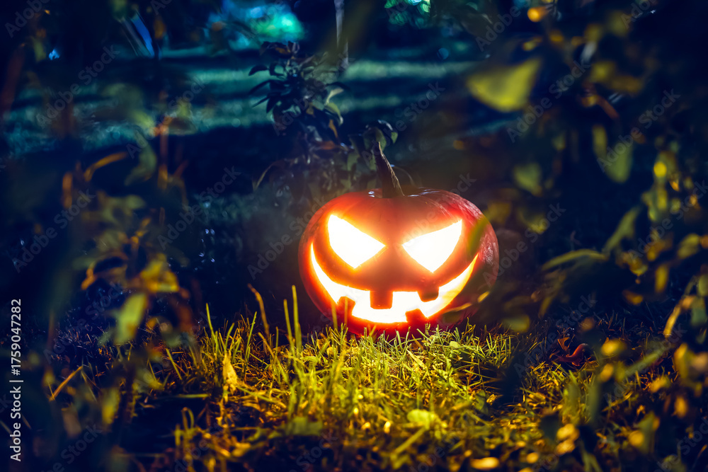 Halloween holiday decoration. Jack-o-lantern glowing Pumpkin head with scary smiling face among autumn fall leaves. Happy scary pumpkin close-up.