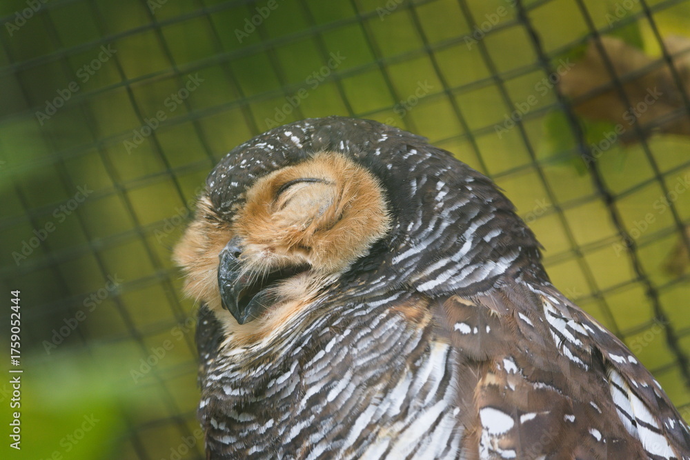 Spotted Owl (Strix seloputo) close-up portrait of a sleeping head — captive animal. Zoo Zlin Lesna in Czech republic.