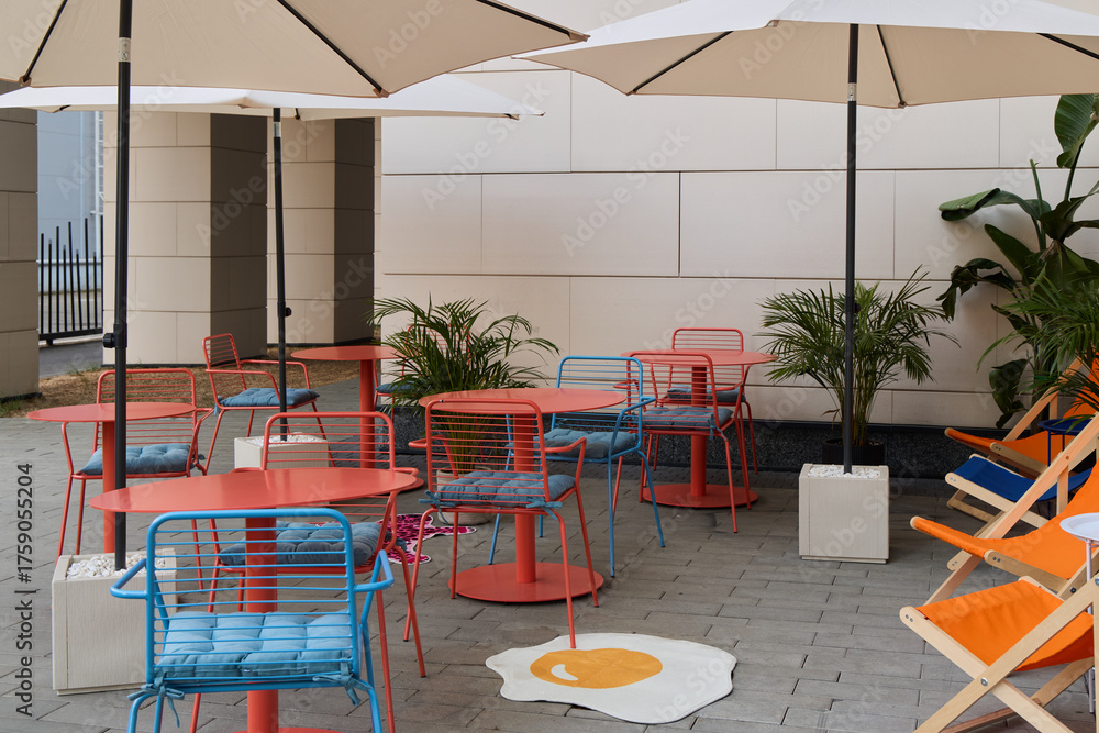 A Colorful Outdoor Cafe Seating Area featuring umbrellas that enhance the delightful atmosphere