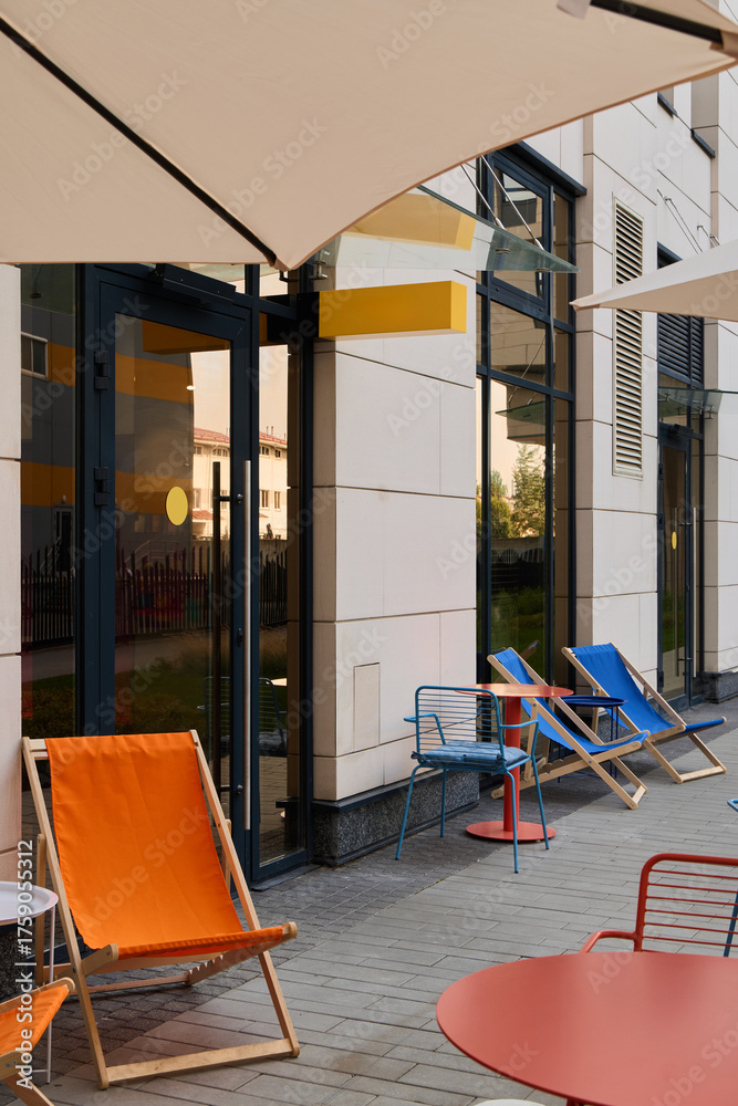 A Beautiful and Modern Outdoor Seating Area Featuring Colorful and Trendy Furniture Options
