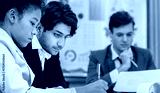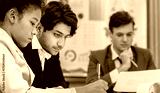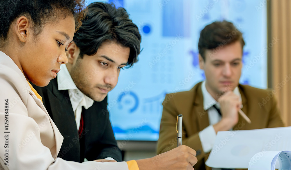 A group of business professionals are working together in an office setting. They are looking at a document and discussing it.
