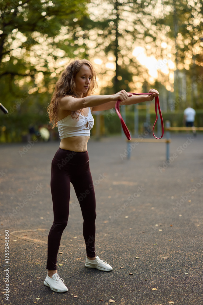 A woman is exercising outdoors with resistance bands during a beautiful sunset moment