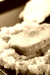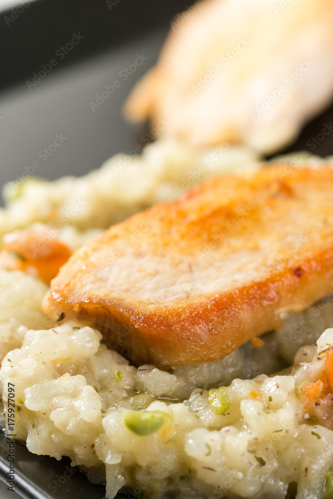 Closeup macro of fried chicken white meat with risotto in the black square plate
