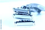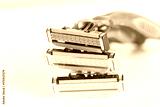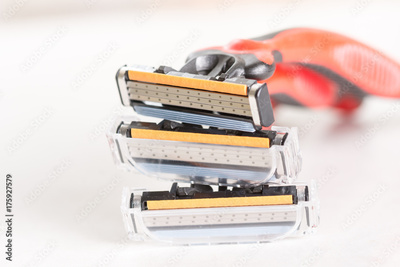 Closeup macero of shaving razor blades isolated on white background with shallow depth of view
