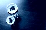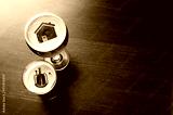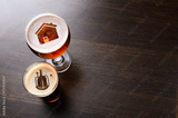 Local craft beer. House and heart silhouettes in two glasses of fresh beer on pub table, view from above