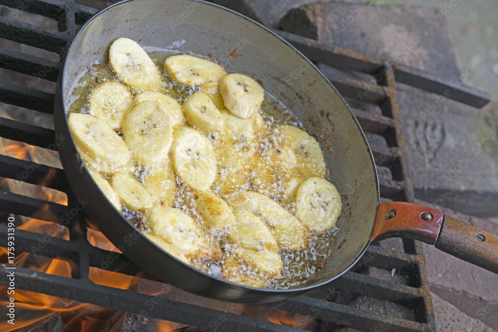 Baking banana on a open fire place in the garden