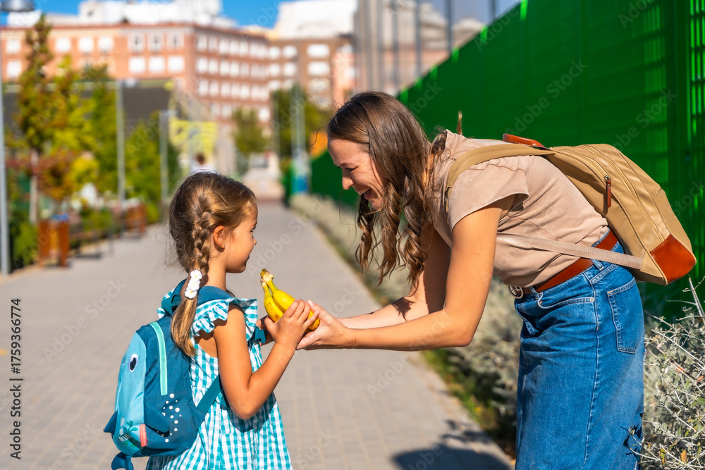 Mother giving daughter bananas for healthy school snack