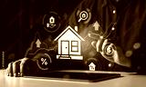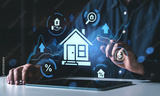 Real estate investment concept with digital hologram house and financial icons on tablet interface by businessperson in modern workspace..