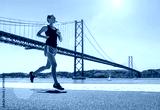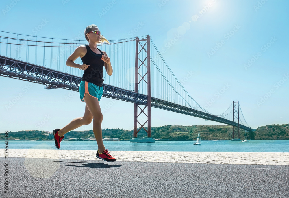Blonde woman running training on the coastline near the Bridge u