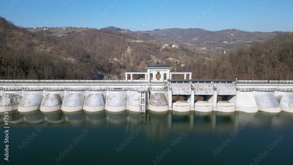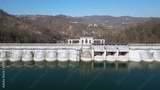 Europe, Italy, Oltrepo Pavese, Molato Dam intercepts the waters of the Tidone stream, Trebecco lake between Lombardy and Emilia Romagna The inauguration 1928, saw the Benito Mussolini participation