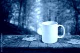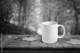 White coffee mug on rustic table with colorful autumn leaves and blurred forest background, ideal for product design mockups