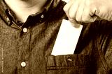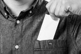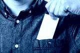 Man's hand takes out blank business card from the pocket