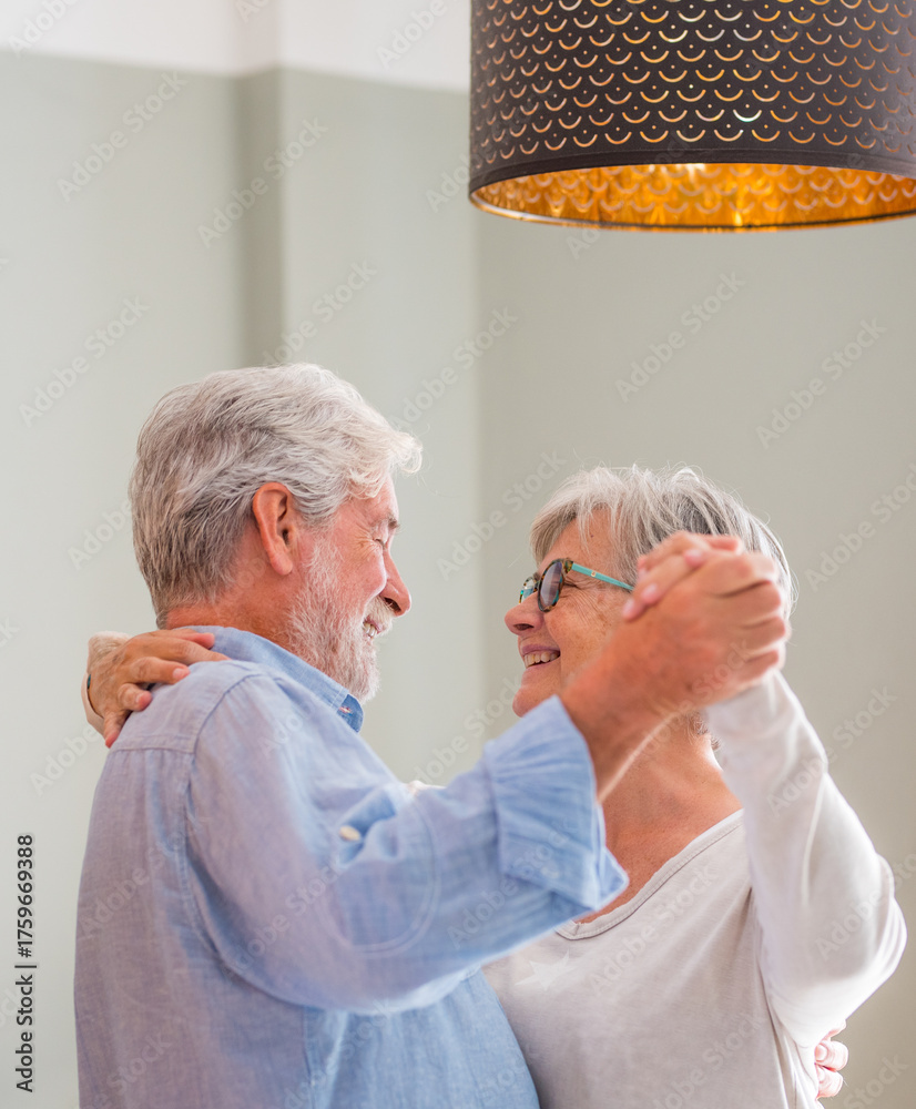 Joyful active old retired romantic couple dancing laughing in living room, happy middle aged wife and elder husband having fun at home, smiling senior family grandparents relaxing bonding together