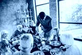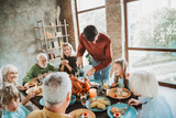 Fun family feast at home joyful gathering around a big turkey as generations come together for thanksgiving dinner