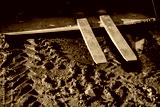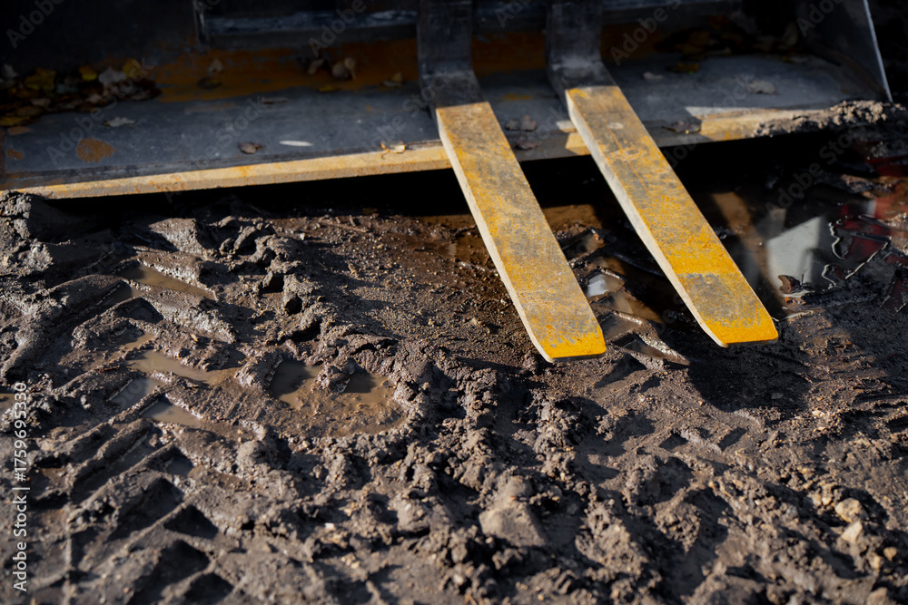Forklift or loader fork attachment resting on muddy construction site ground showing metal tines, dirt texture, and mechanical strength, representing industrial material handling and outdoor equipment