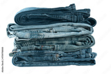 Denim jeans stacked neatly in varied shades of blue