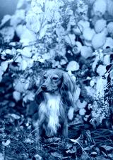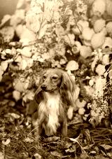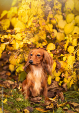 Portret Jamnika długowłosego miniaturowego na tle jesiennych liści.