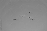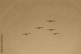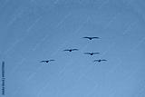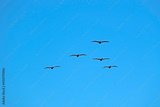 A group of 5 (five) Brown Pelicans flying in formation in a clear blue sky.