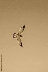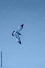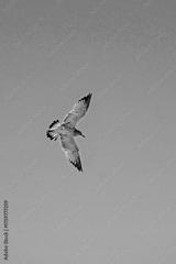 Laughing Gull, Leucophaeus Atricilla, flying in a clear blue sky and showing the underside of its wingspan.
