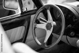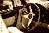 Detailed view of a vintage car's interior, showing the wood and metal steering wheel and side mirror.