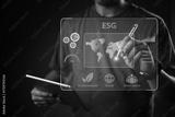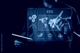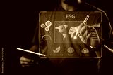 ESG concept. Man holding tablet analyze virtual dashboard. Corporate sustainability strategy, environmental social governance. Global data chart, green business development goal.