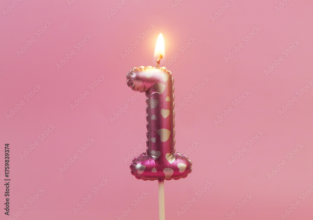 Burning air balloon shaped birthday candle with hearts on pink background, number 1