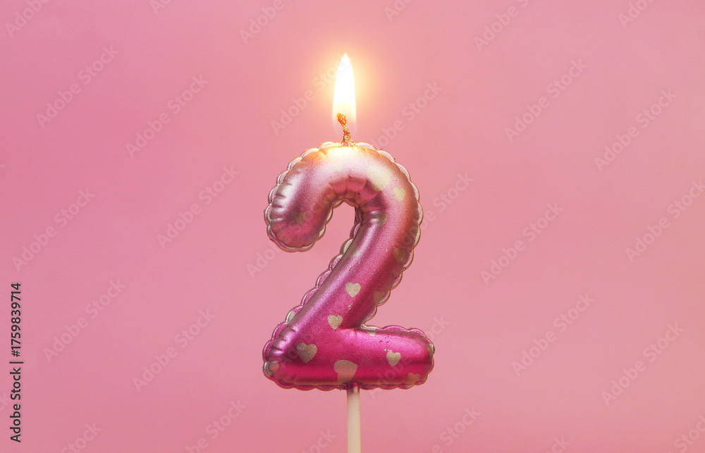 Burning air balloon shaped birthday candle with hearts on pink background, number 2