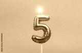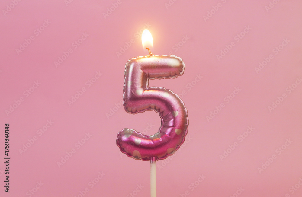 Burning air balloon shaped birthday candle with hearts on pink background, number 5
