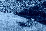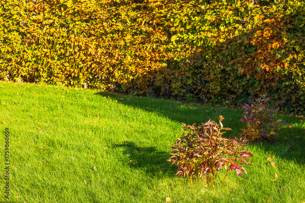 Beautiful view of peony bushes with red and yellow autumn leaves on background of green lawn and hedge in villa garden. Sweden.