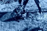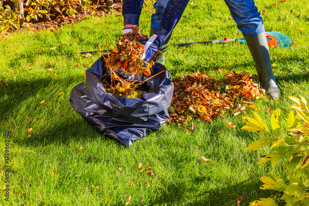 Close up view of person collecting fallen leaves and peony stems into plastic bag on background of green autumn lawn. Sweden.