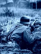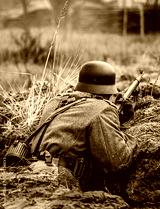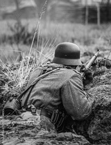 Re-enactors Dressed As German Wehrmacht Infantry Soldiers In World War II Hidden Sitting With Rifles Weapons In An Ambush In Trench