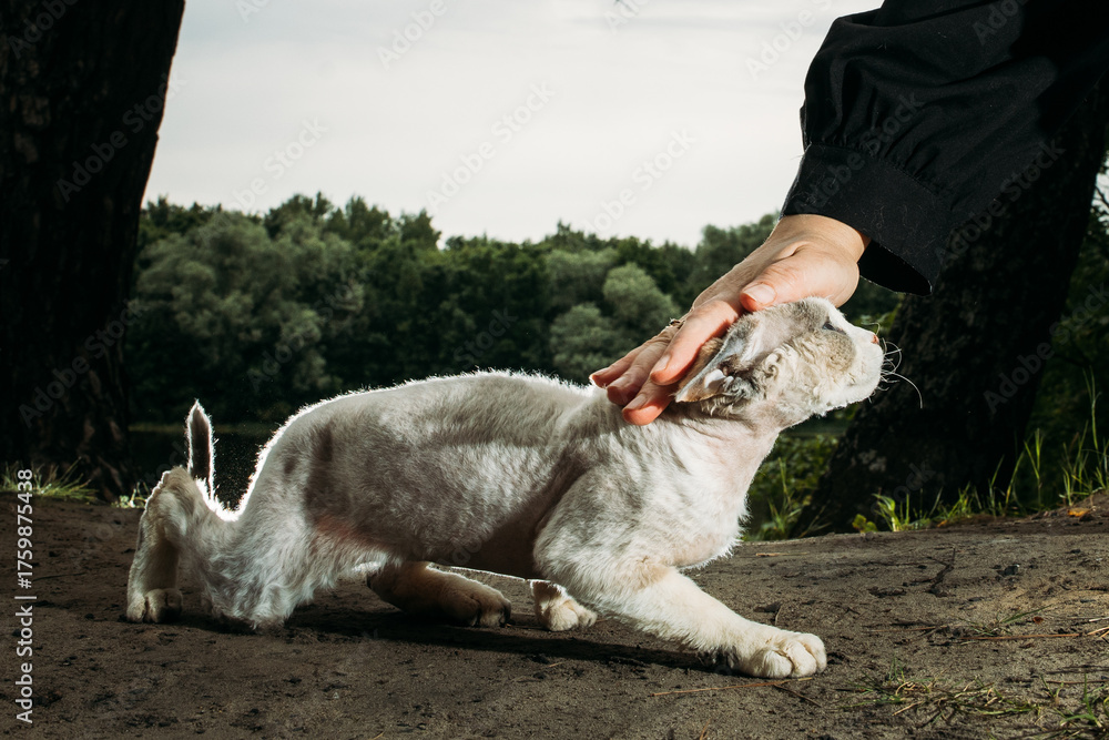 Hand petting a playful cat outdoors, serene atmosphere Devon Rex