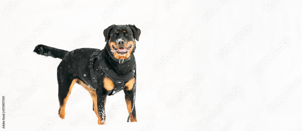 Black Rottweiler Metzgerhund Dog In Snow During Winter Day. Dog Is Dressed In A Special Training Suit