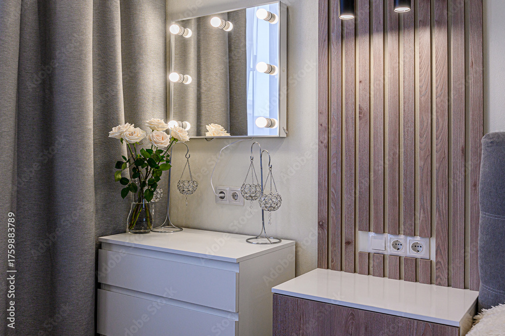 Cozy bedroom corner with a vanity mirror, white dresser, roses, and wood-paneled accent wall. Soft, elegant, and inviting