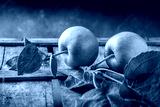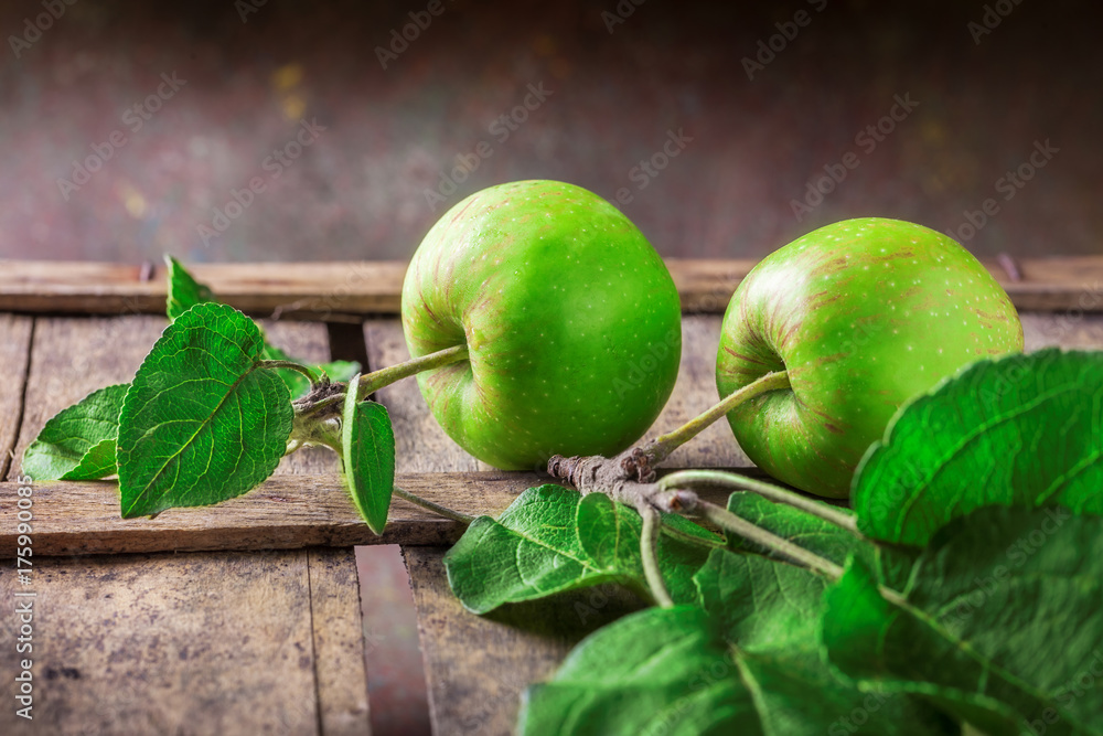 Organic green apple branches in studio with leaves on old rustic brown wooden box and dark painted background in studio