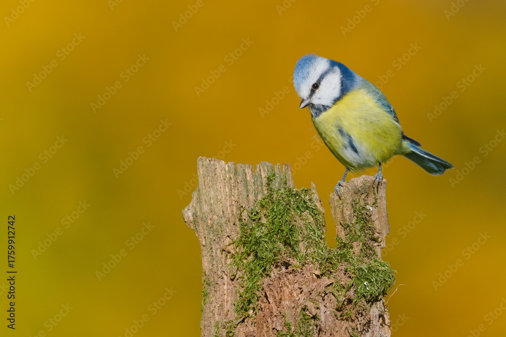 Blue Tit (Cyanistes caeruleus) on a mossy old stump with autumn background - common bird species in the Czech Republic.