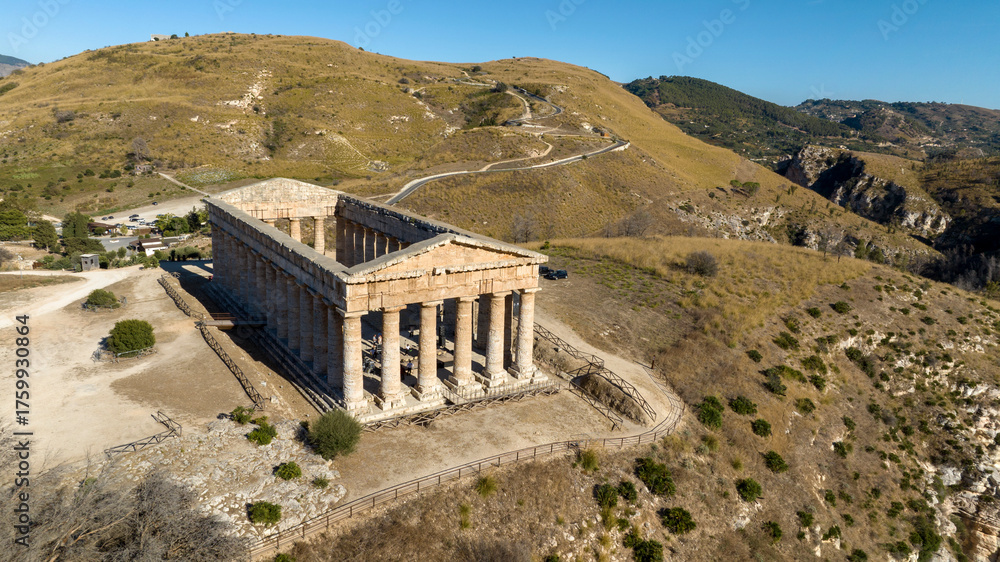 Aerial view of the Temple of Segesta, located near Palermo. It is an Elymian temple of the ancient Greek city located in the archaeological area of Calatafimi-Segesta, in Sicily, Italy.